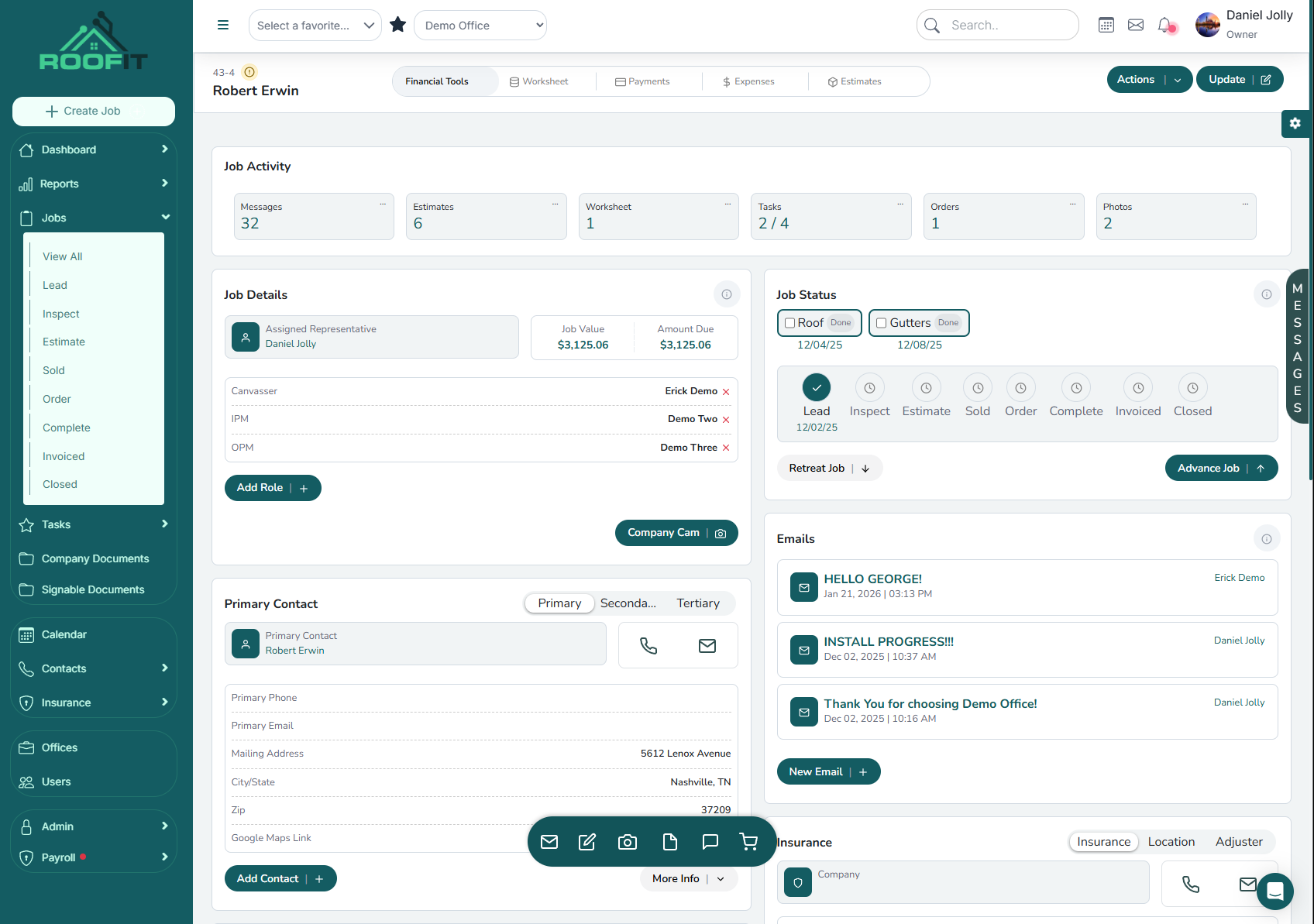 Roofing crews rely on the right tools to get the job done; your office should, too. RoofIT brings every operational tool your business needs into one simple platform. As a fully customizable CRM software, it gives your team a unified place to manage leads, jobs, estimates, proposals, billing, and communication.