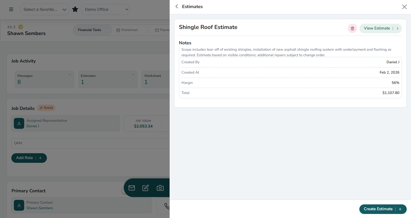 Sales reps can create roof estimates in the field. Office staff can track approvals and follow up. Owners can review performance without digging through files. Everyone works from the same system, using the same data.